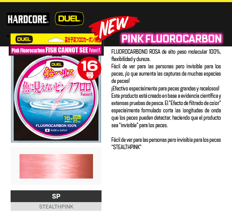 - Bajo de línea: DUEL Pink Fluoro de 1,5 a 1,8 metros y diámetro 0,23-0,28 mm.