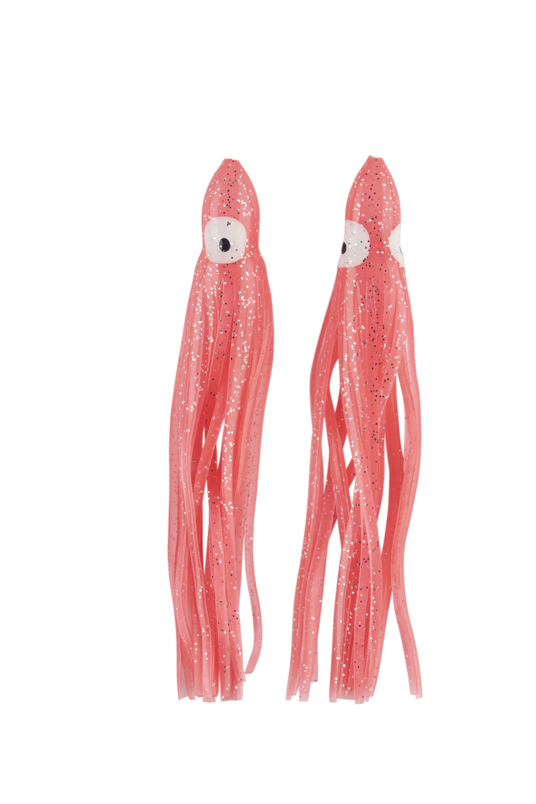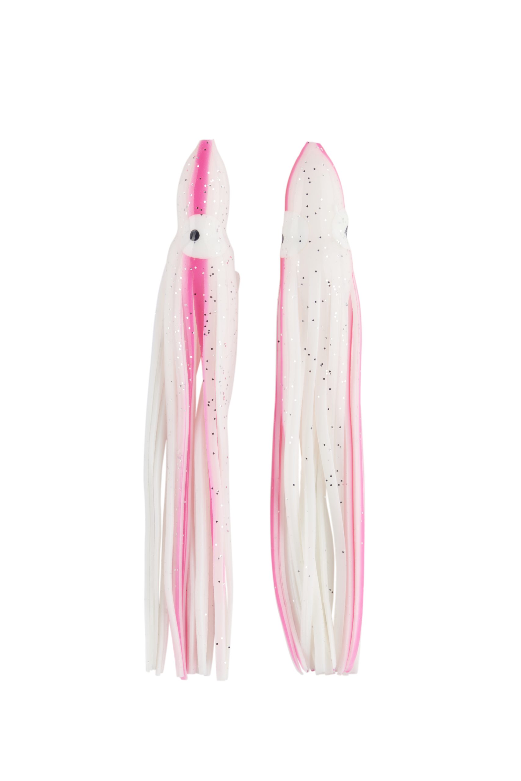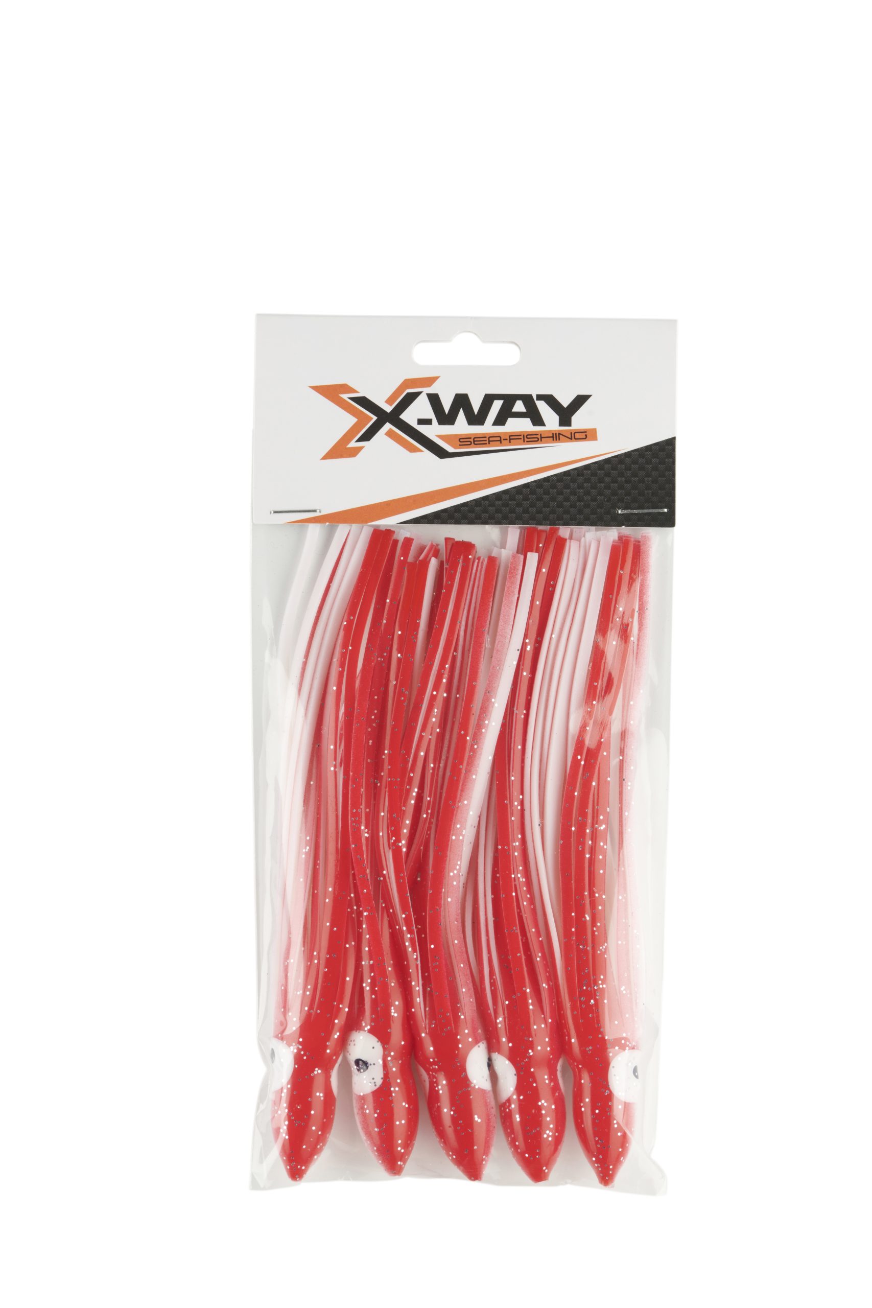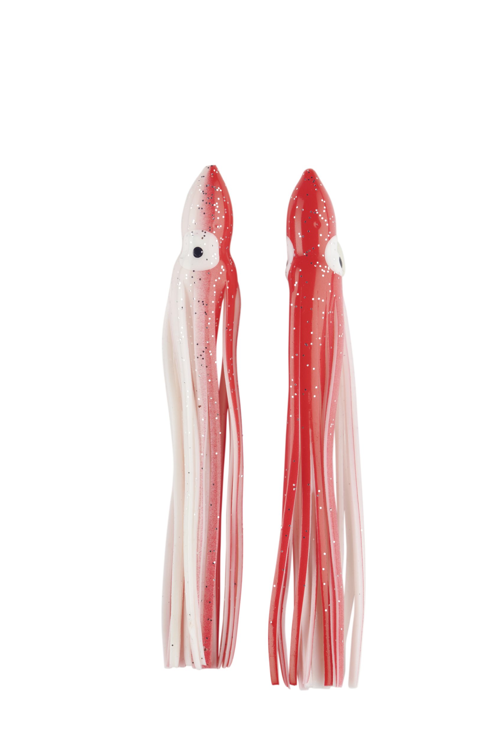 Señuelo tipo pulpito fabricado en silicona suave y resistente, ideal para montajes de curricán y pesca marítima. Su diseño bicolor rojo/blanco con destellos plateados imita a la perfección el movimiento de un calamar, atrayendo peces depredadores como atunes, dorados y jureles.